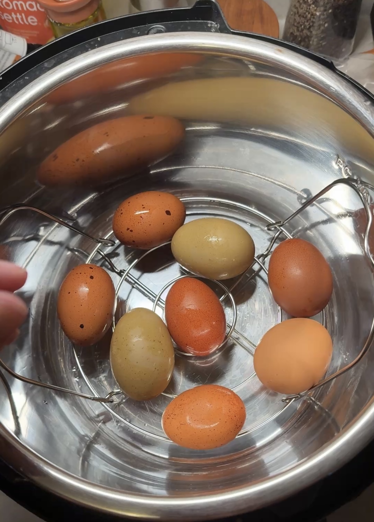 Use your Instant Pot trivet and layer the eggs in a single layer.