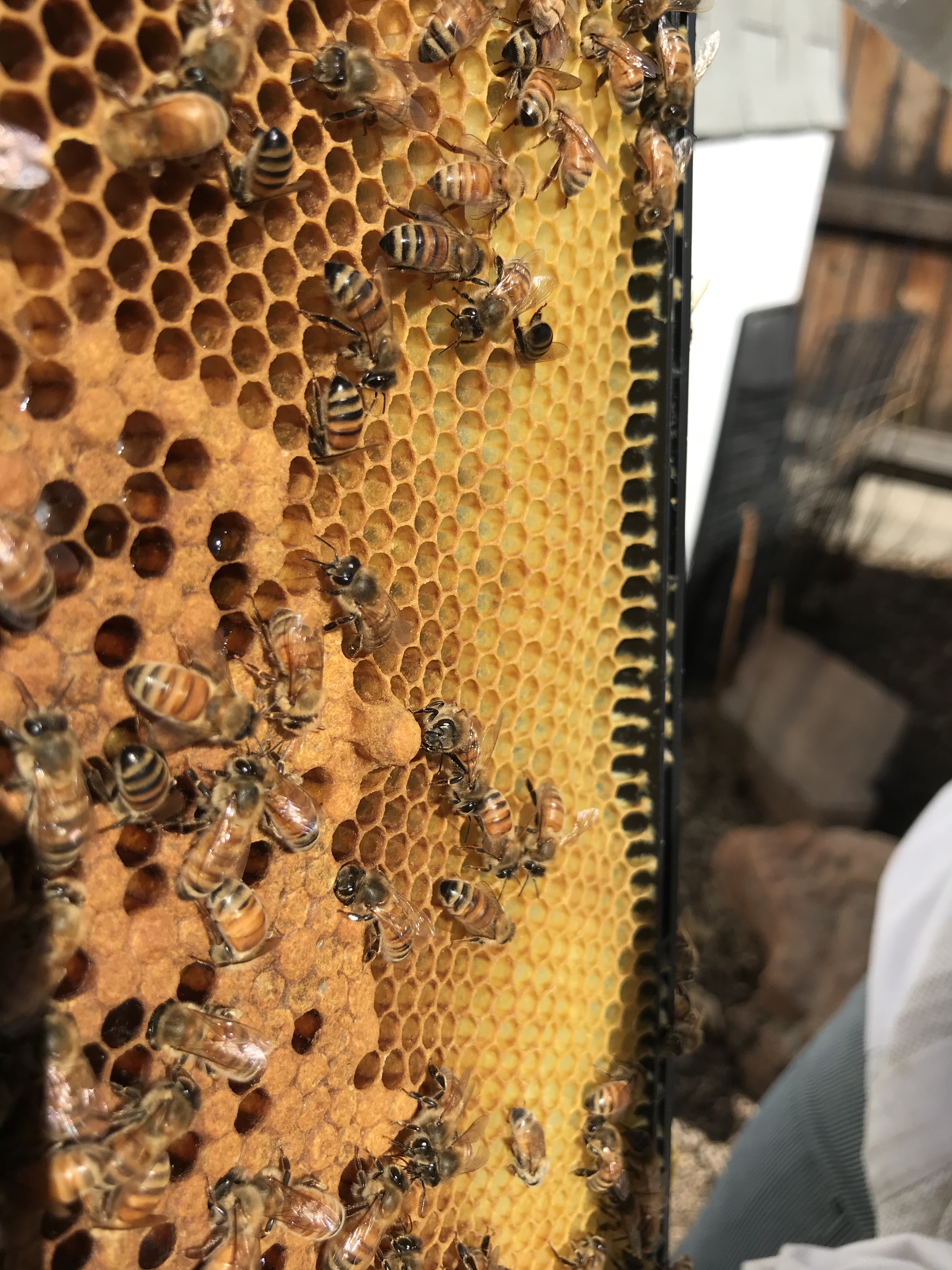 Our primary goal is to maintain a healthy colony, and to reap any excess honey benefits in the process. We make sure to do routine checks to ensure the colony is thriving and the queen is laying effectively. We watch for signs of mite infestation, swarm signs, signs of an unhappy colony, and brood health. Once the colony is stable and is on its way to make enough honey to support itself through the winter months, we move forward with adding a honey super. We only collect excess because the colony health is our priority. That being said, the first time we harvested honey we extracted 33 pounds (3 gallons) of honey! How sweet! (ew that was a gross pun and I didn’t like it).