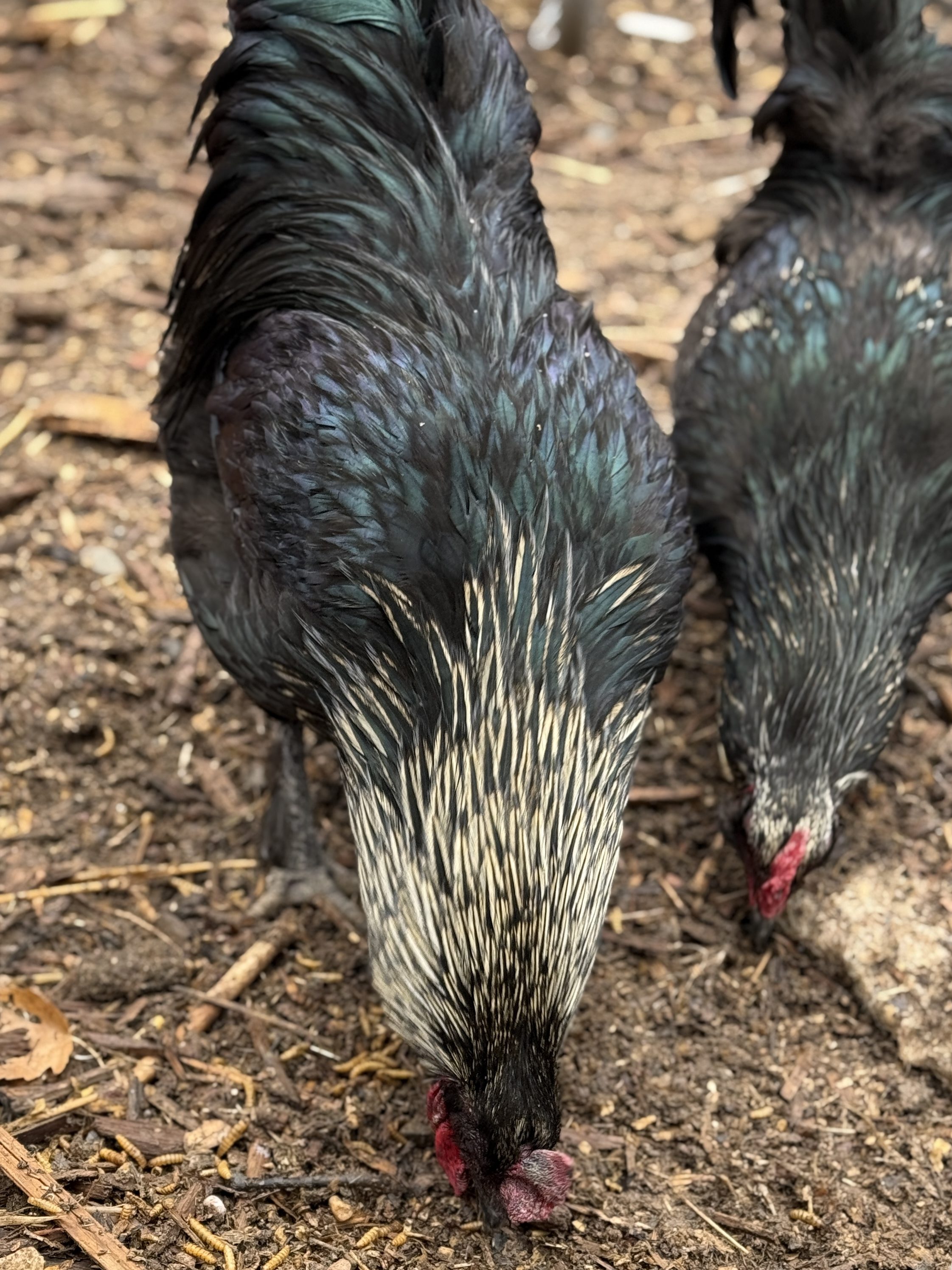 One of the three chicks from the first brood we’ve raised, he turned out to be a little rooster. He and his brother, Pork, are beautiful birds and are both skittish and skeptical – but are great little beasts and we love them!